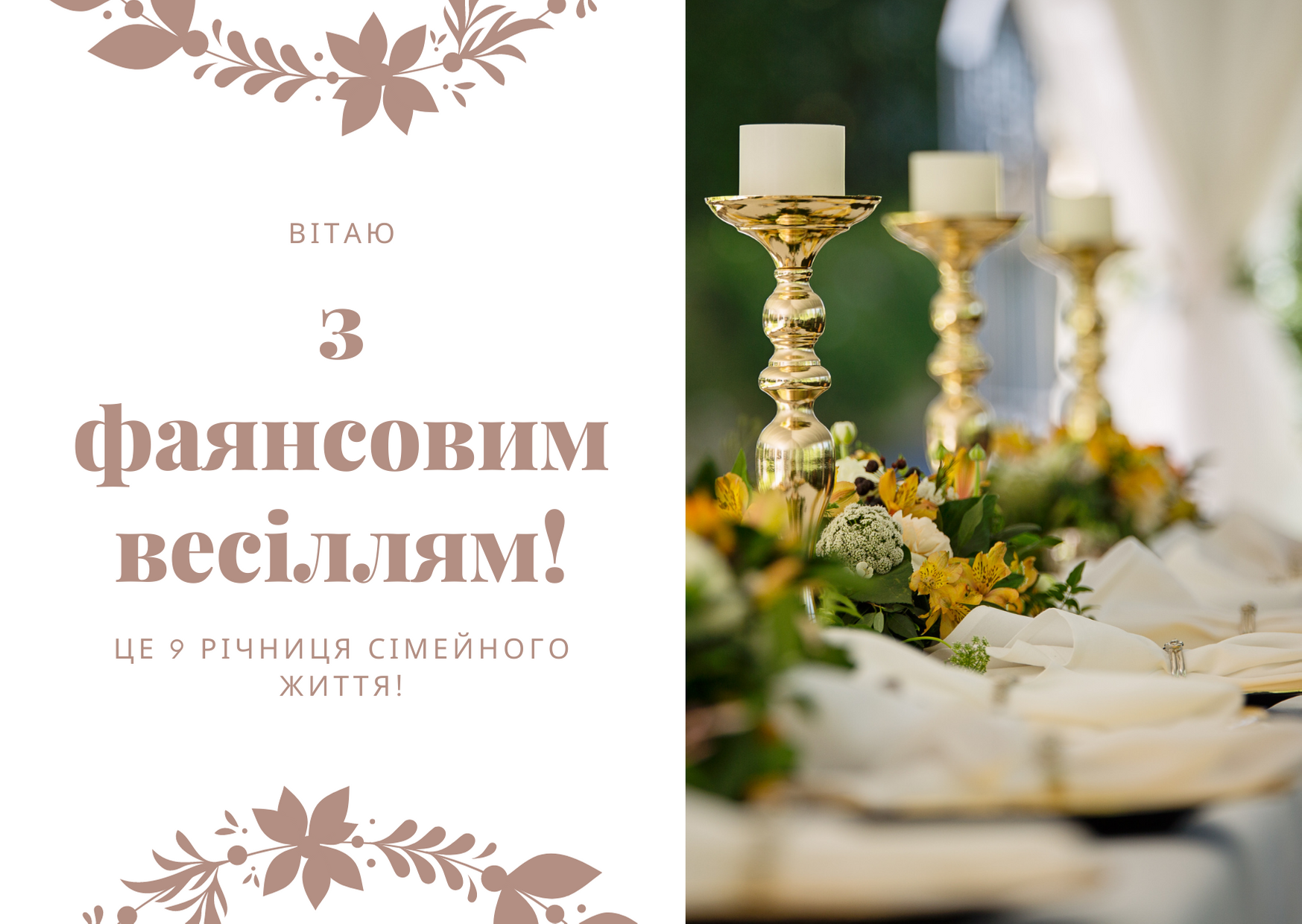 Вітаю з дев’ятою річницею весілля! Ви пройшли чудовий шлях довгою в дев’ять років, зберігши головніше – любов і вірність. Нехай ваша фаянсова чаша завжди буде повною: достатку, здоров’я, взаєморозуміння і щастя. Бажаю вам разом долати будь-які труднощі, радіти кожній хвилині і створювати незабутні спогади. Хай ваша родина міцніє з кожним днем!